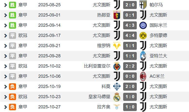 尤文图斯本赛季从意甲三连胜开局,特别是联赛第3轮,尤文图斯主场4-3击败国际米兰,此刻感觉斑马变成骏马,尤文图斯走在正确的复兴之路上。但随后欧冠+意甲,尤文图斯遭遇五连平;到了最近3轮,尤文图斯竟然遭遇了各项赛事三连败,这一切要从客场0-2输给科莫说起,尤文图斯是完败给对手,随后遭遇强队,两个0-1输给皇马+拉齐奥。
