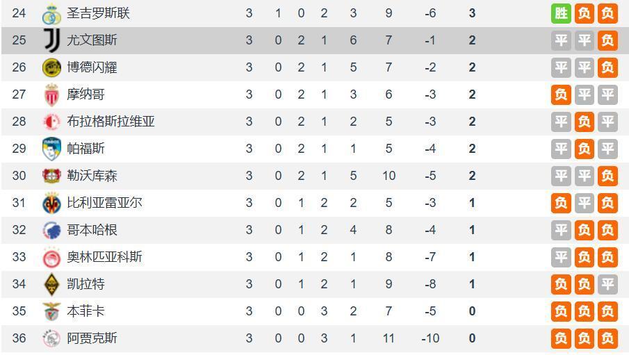 尤文图斯本赛季的欧冠成绩更是惨不忍睹,3轮2平1负积2分,排名第二十五,位于淘汰区。欧冠扩军后变成联赛阶段8场比赛,排名前八的直接晋级,第9-24位进行两回合的附加赛,决出另外8个欧冠1/8名额;而排名第25-36位的直接淘汰,不再降级去欧联杯了。